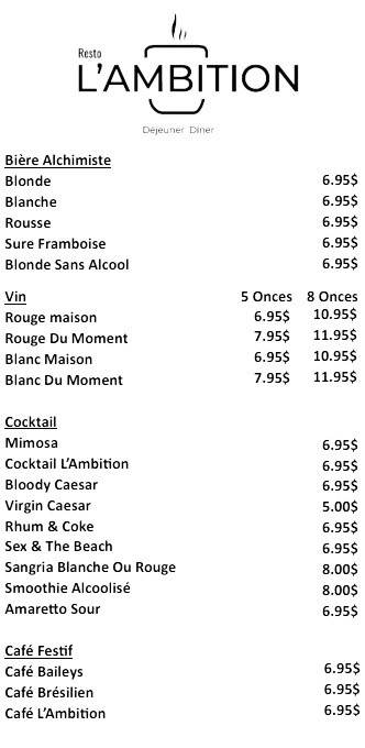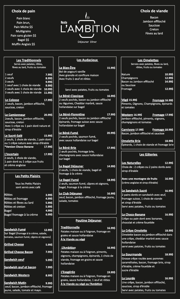 Que vous soyez amateur de crêpes copieuses avec du vrai sirop d'érable, de déjeuner classique ou à la recherche d'options plus légères, notre menu saura satisfaire toutes vos envies.