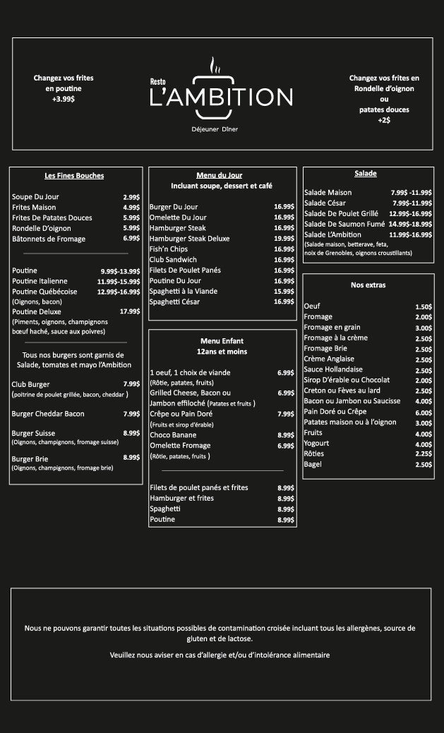 Que vous soyez amateur de crêpes copieuses avec du vrai sirop d'érable, de déjeuner classique ou à la recherche d'options plus légères, notre menu saura satisfaire toutes vos envies.